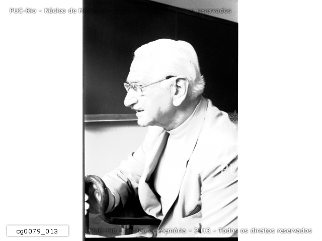Fotografia de perfil do cientista Albert Sabin. Na ocasião, Sabin era aluno do curso de Português para Estrangeiros da PUC-Rio e concedeu entrevista para a Assessoria de Imprensa da Vice-reitoria de Desenvolvimento. |