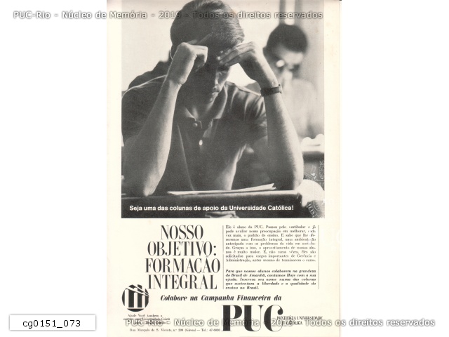 Campanha Financeira "Seja uma das colunas de apoio da PUC". Foto de alunos em sala da aula. Título: "Nosso objetivo: formação integral". "Uma universidade cristã para o Brasil cristão". |