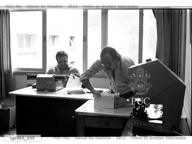 O professor Afonso dos Santos na máquina de microfilme analisa documentos da pesquisa institucional do Departamento de História da PUC-Rio intitulada "Forças de segurança e ordem no Rio de Janeiro - 1822 a 1915", financiada pela Financiadora de Estudos e Projetos (FINEP). |
