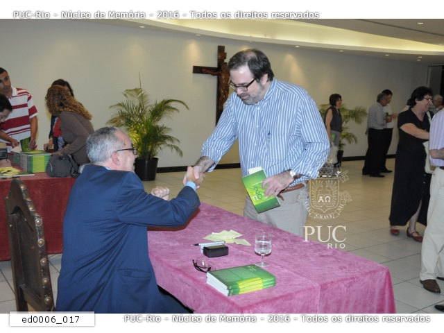 Convidado cumprimenta o Reitor Pe. Josafá S.J. na mesa de autógrafos. |