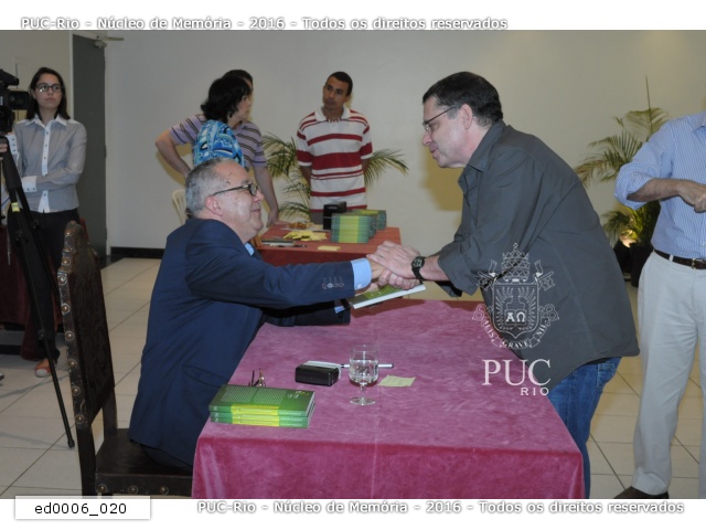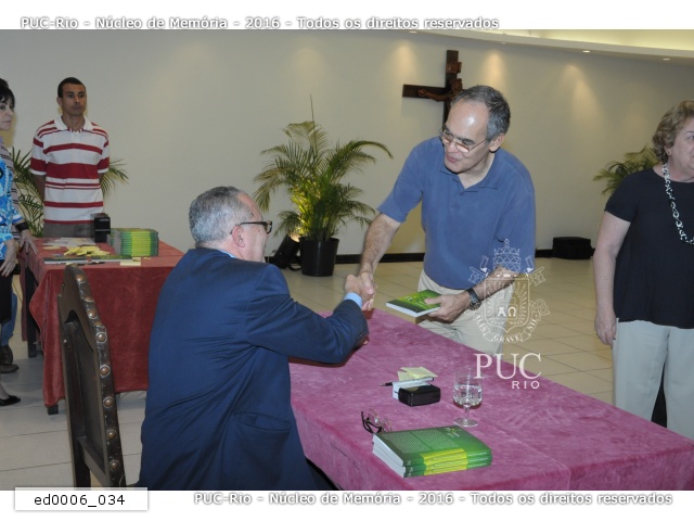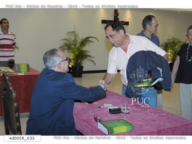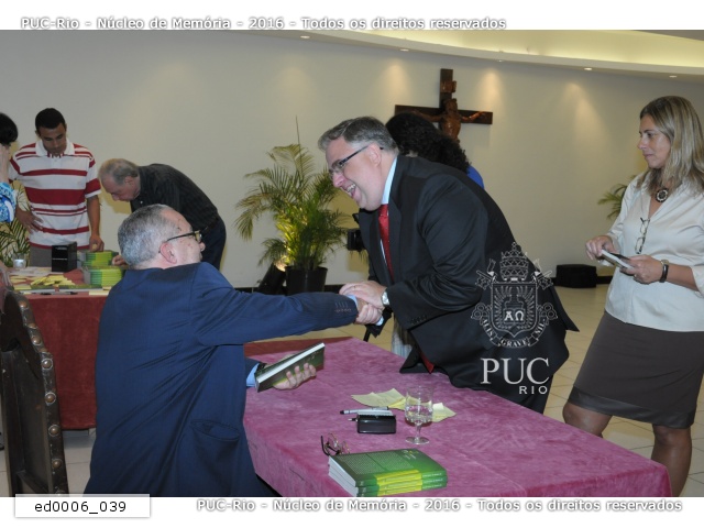 Convidado cumprimenta o Reitor Pe. Josafá S.J. na mesa de autógrafos. |