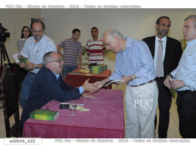 Convidados em volta da mesa de autógrafos do Reitor Pe. Josafá S.J.. |