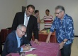 O prof. Cesar Romero cumprimenta o reitor pe. Josafá S.J. na mesa de autógrafos. |