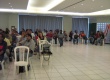 Vista do salão da Pastoral com funcionários reunidos durante a confraternização. |
