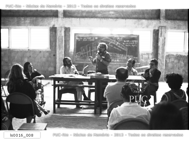 Palestra do Movimento Universidade à Serviço do Povo (MUSP) sobre sua atuação nas favelas do Rio de Janeiro. Realizada no espaço, ainda em obras, onde hoje é o Auditório Padre Anchieta. |