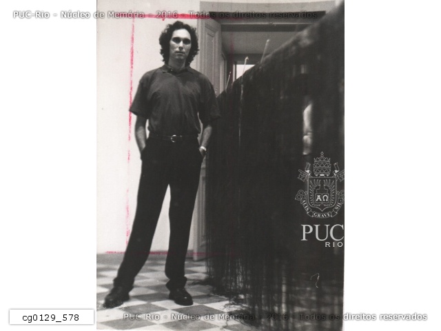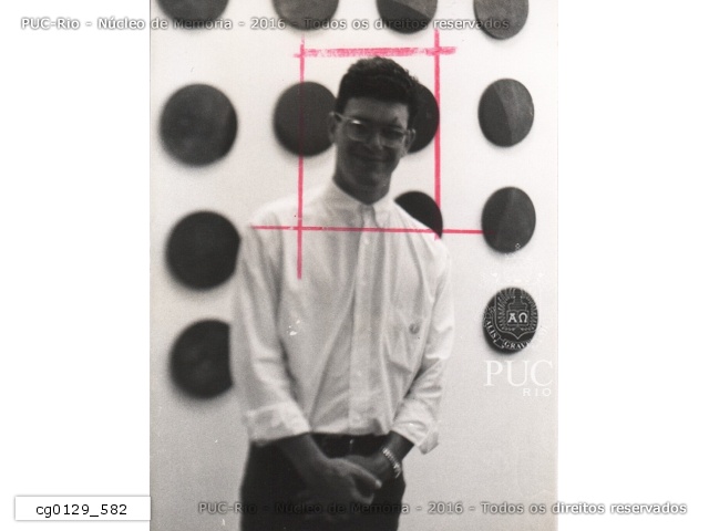 Retrato individual do artista plástico Marcelo Lago, cuja obra composta por discos de ferro ficou em exposição no Solar Grandjean de Montigny de 24 de abril a 9 de maio de 1992. |