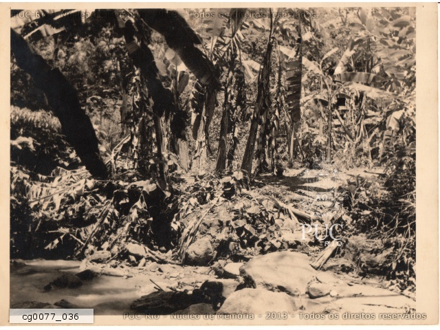 Terreno do campus Gávea ainda coberto de vegetação, inclusive bananeiras. |