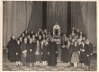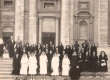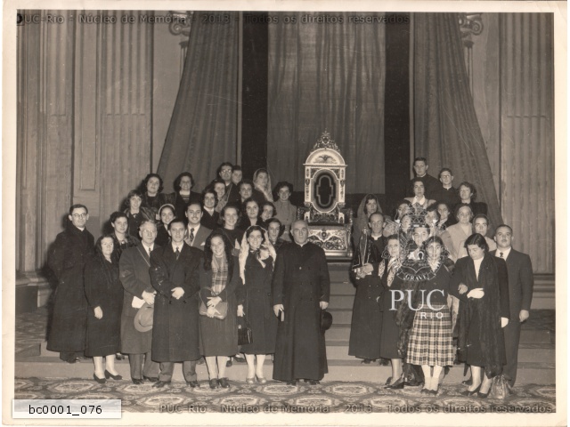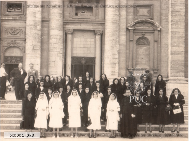 Grupo de alunos com a Pedra Fundamental do novo campus da PUC-Rio, após a benção do Papa Pio XII. Durante a peregrinação ao Vaticano no Ano Santo. |