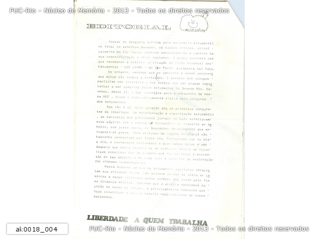 Editorial. Jornal do CTC da chapa Alternativa, do movimento estudantil da PUC-Rio, número 02. Refere-se às manifestações estudantis ocorridas nos meses anteriores, particularmente em São Paulo, sob muita repressão mas com saldo positivo, como a criação da união Estadual dos Estudantes neste estado. |