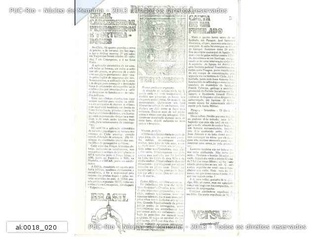 Sobre a situação política no Chile: artigo e letra de música. Jornal da chapa Alternativa, do CTC, do movimento estudantil da PUC-Rio, número 03. |