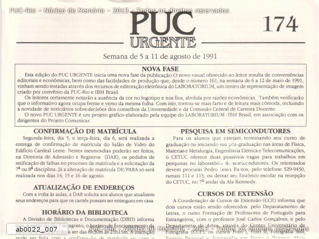 Primeira página da edição número 174 do PUC Urgente da semana de 05 a 11 de agosto de 1991. O PUC Urgente destaca em sua primeira página o novo visual da publicação e o projeto gráfico elaborado pela equipe do Laboratorium da IBM Brasil em associação com o Projeto Comunicar. |