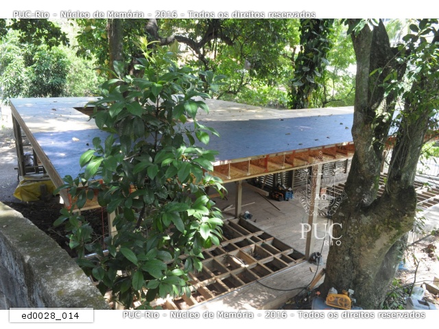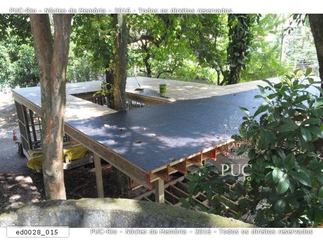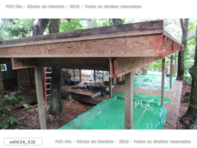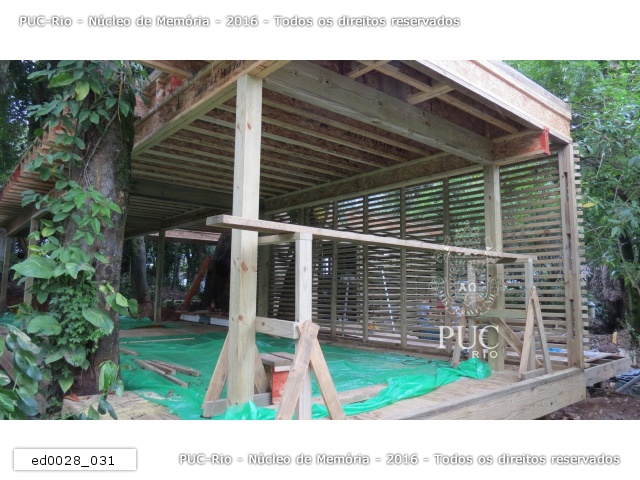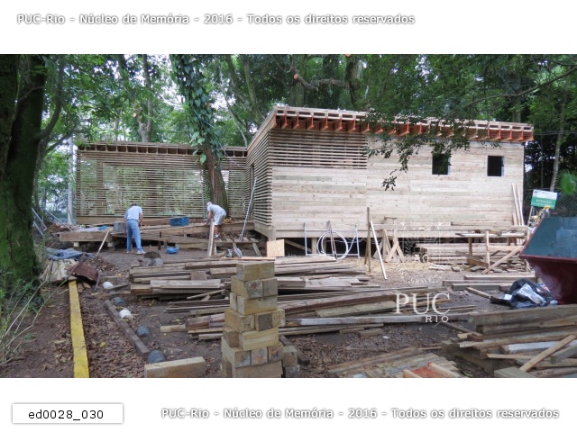 ed0028_016 | 2/4/2012 | Montagem do piso da Casa Modelo entre as árvores. |