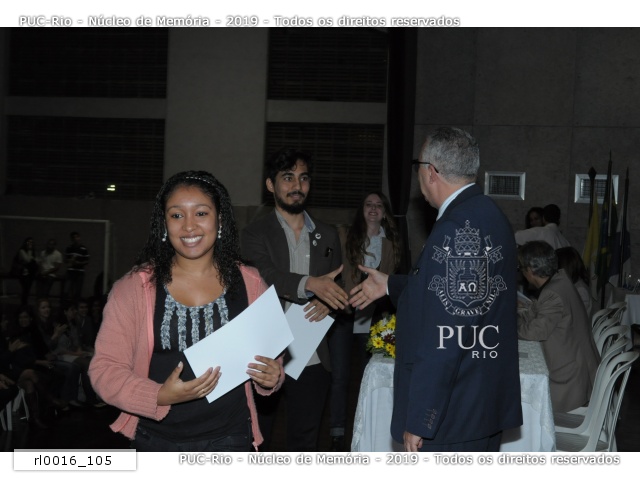 rl0016_097 | 31/8/2012 | Professor Paulo César parabeniza a aluna pela participação no XX Seminário de Iniciação Científica da PUC-Rio. |