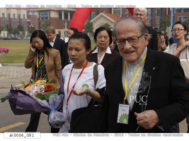 ak0006_081 | 2008 | Pe.Hortal e interpréte em um campus universitário na China. |