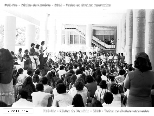 ak0011_003 | 20/11/1979 | Alunos reunidos nos pilotis com membros da Chapa Unidade em palanque, no aguardo da chegada de Miguel Arraes. Vista a partir da escada da Ala Frings. Faixa onde se lê "Em greve geral". |