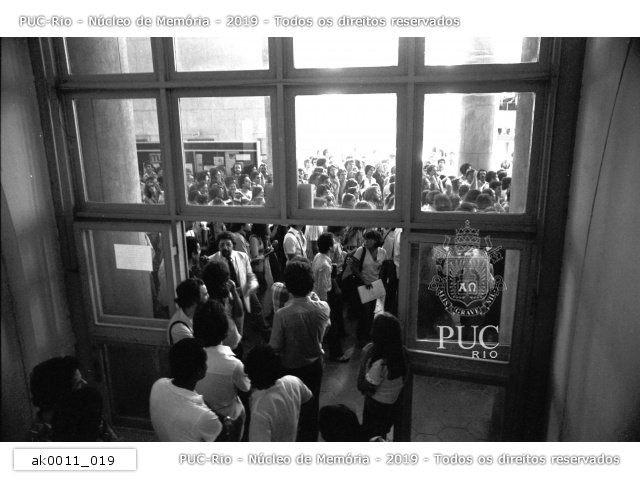 ak0011_029 | 20/11/1979 | Alunos reunidos na frente do portão de entrada da PUC-Rio na tentativa de participar do encontro com Miguel Arraes. |