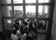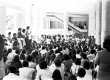 ak0011_019 | 20/11/1979 | Alunos reunidos no pilotis aguardam Miguel Arraes. A foto foi tirada de dentro de um dos laboratórios do ITUC. |