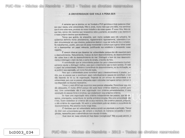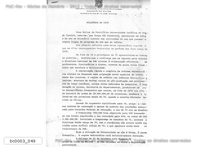 bc0003_032 | 3/1979 | O Relatório apresenta o balanço das atividades acadêmicas da PUC-Rio do ano de 1978. A publicação contém informações do corpo docente e discente, da Associação dos Docentes (ADPUC) e da Associação de Funcionários (AFPUC), do projeto de reformulação da Regulamentação da Carreira Docente e dos convênios estabelecidos com a FUNARTE, FINEP, BNDE, MEC, IPHAN, entre outros. Destaca os projetos, os eventos, as palestras e os seminários realizados em 1978 e traz também dados sobre a situação financeira da Universidade e das bolsas de estudos. O Relatório foi apresentado pelo reitor pe. João Mac Dowell S.J. na abertura do ano acadêmico em 09 de março de 1979. |