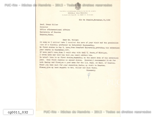 cg0011_032 | 29/11/1966 | Correspondência do prof. Ruy Schneider (IND) para prof. Frank Tiller (University of Houston). |