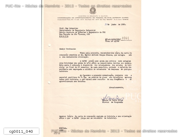 cg0011_040 | 30/6/1966 | Correspondência com timbre do Ministério da Educação, de Nelson do Valle Silva (CAPES) para o prof. Ruy Schneider (IND). |