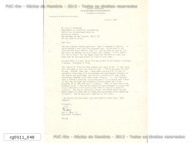 cg0011_048 | 6/6/1966 | Correspondência com timbre da Stanford University, do prof. Roy Lave (Stanford University) para o prof. Ruy Schneider (IND). |