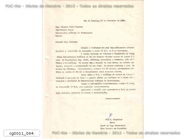 cg0011_064 | 17/2/1966 | Correspondência do prof. Ruy Schneider (IND) para Vicente Herrera (Universidad Autônoma de Guadalajara). |