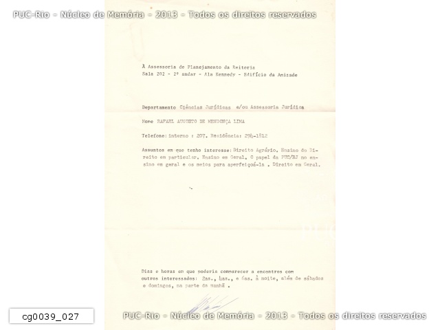 cg0039_027 | 1978 | Ficha de Rafael Augusto de Mendonça Lima, com interesses para discussão no contexto universitário. |