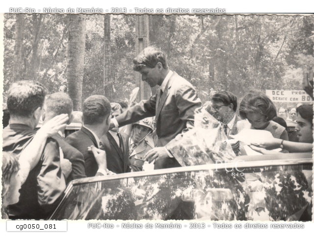 cg0050_073 | 25/11/1965 | O senador Robert (Bob) Kennedy cercado pelo público na inauguração do busto de seu irmão, John Kennedy, nos pilotis do Edifício da Amizade. |