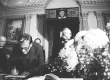 cg0050_113 | 6/3/1995 | À esquerda, Chanceler da Cúria, Monsenhor Lucas Malaquias; o pe Jesus Hortal assinando; atrás, Pe Laércio Dias e Dom Eugênio Sales na cerimônia da posse do pe Jesus Hortal como novo reitor da PUC-Rio. |