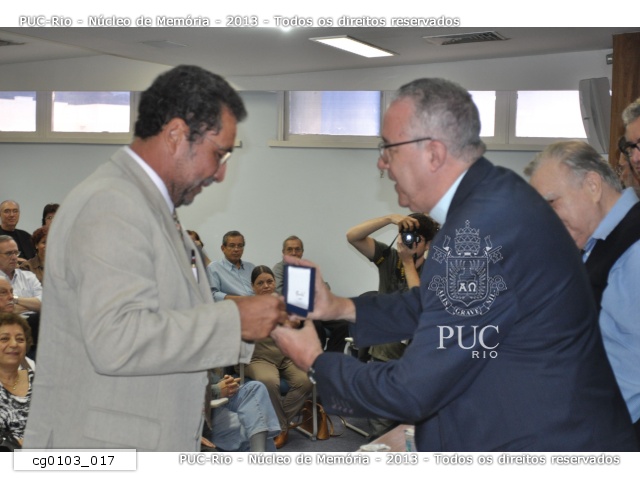 O Prof. Luiz Fernando A.Azevedo, do Departamento de Engenharia Mecânica, recebe a medalha comemorativa aos 70 anos da PUC-Rio. |
