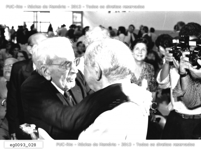 eg0093_030 | 22/3/1991 | O advogado Sobral Pinto e dom Helder Camara se cumprimentam na cerimônia que concedeu aos dois o título de Doutor Honoris Causa pela PUC-Rio. |