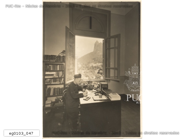 eg0103_047 | 1930 | Pe. Crespo S.J., auxiliar direto do Provincial da Companhia de Jesus, em sua sala de trabalho no Colégio Santo Inácio. Vista para o Corcovado. |