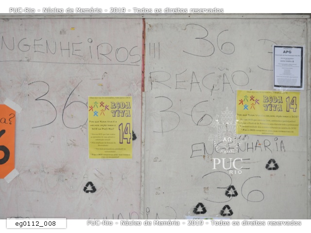 eg0112_006 | 7/11/2011 | Painel fixado nos pilotis da ala Kennedy com propagandas das chapas que concorreram às eleições de 2011 para o Diretório Central dos Estudantes da PUC-Rio (DCE). Chapas Roda Viva, Integração, e outras. |