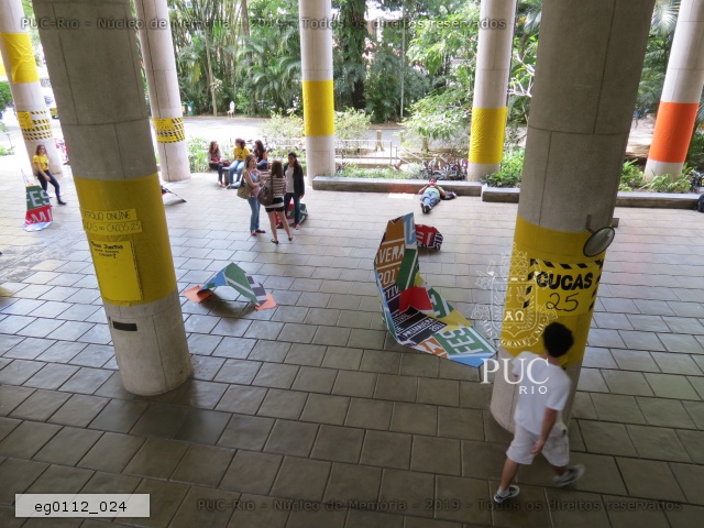 eg0112_024 | 7/11/2011 | Intervenção com faixas laranja e amarela nos pilotis com propaganda de chapas que disputaram as eleições de 2011 para o Diretório Central dos Estudantes da PUC-Rio (DCE), propagandas do Festival da Primavera. |