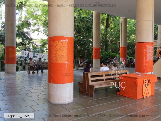 eg0112_062 | 7/11/2011 | Pilotis decorado com faixas laranja com propagandas de chapas que disputavam as eleições de 2011 para o Diretório Central dos Estudantes da PUC-Rio (DCE). |