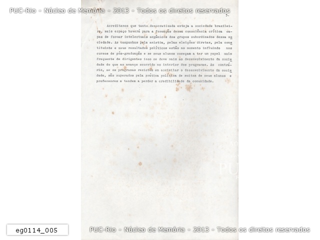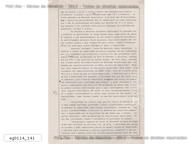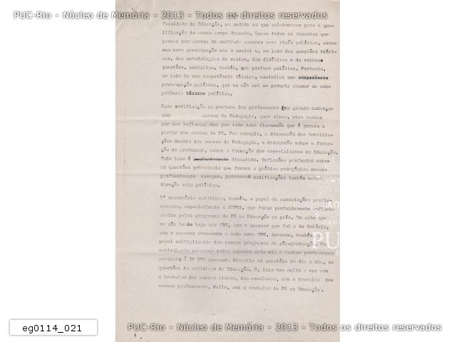 eg0114_021 | 11/1986 | Artigo intitulado 'Pós-Graduação e competência política', de autoria da professora Glaura Vasquez de Miranda, apresentado no Seminário dos 20 anos do mestrado em Educação da PUC-Rio. |