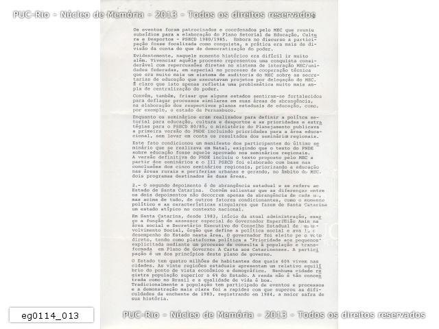 eg0114_013 | 11/1986 | Artigo intitulado 'Pós-Graduação e competência política', de autoria do professor Antenor Manoel Naspolini, apresentado no Seminário dos 20 anos do mestrado em Educação da PUC-Rio. |