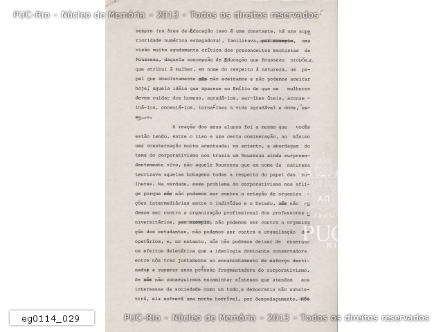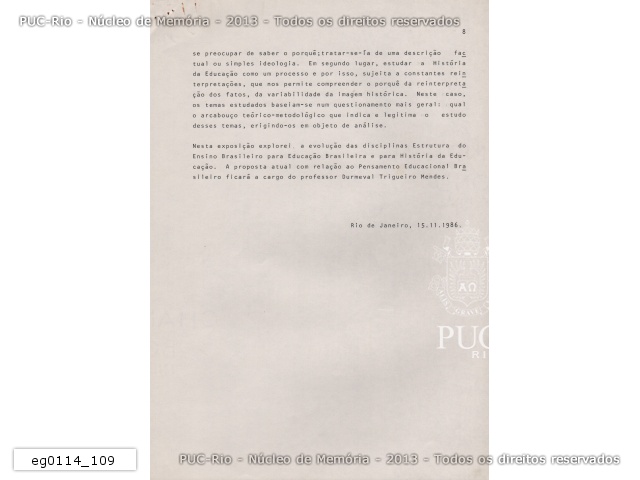 eg0114_109 | 15/11/1986 | Artigo intitulado 'Da estrutura do ensino ao pensamento educacional brasileiro' de autoria da professora Maria de Lourdes Fávero, apresentado no seminário dos 20 anos do mestrado em Educação da PUC-Rio. |