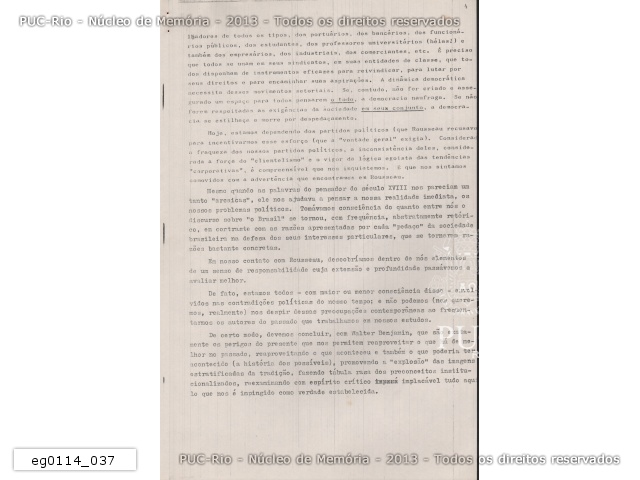 eg0114_117 | 11/1986 | Artigo intitulado 'Anotações sobre o pensamento educacional no Brasil' de autoria do professor Durmeval Trigueiro Mendes, apresentado no seminário dos 20 anos do mestrado em Educação da PUC-Rio. |
