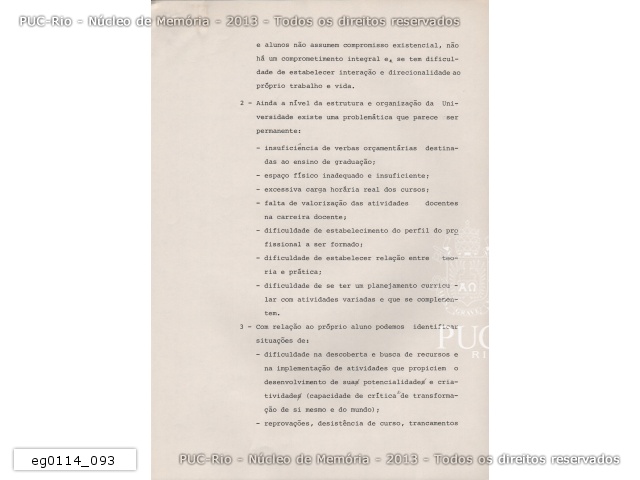 eg0114_093 | 11/1986 | Artigo intitulado 'Uma realidade de orientação educacional no 3º grau' de autoria da orientadora educacional Zilda Santesso, apresentado no seminário dos 20 anos do mestrado em Educação da PUC-Rio. |