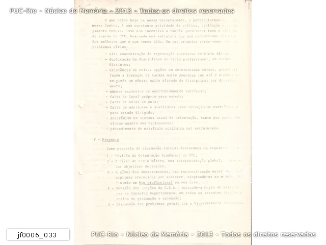 jf0006_033 | 1983 | Diretrizes Acadêmicas para 1983/1984 Centro Técnico Científico. Situação atual do CTC e da PUC. Reprovações no ciclo básico. Proposta. |