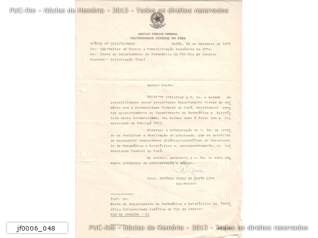jf0006_048 | 11/12/1975 | Convênio entre a PUC-Rio e a Universidade Federal do Pará. |