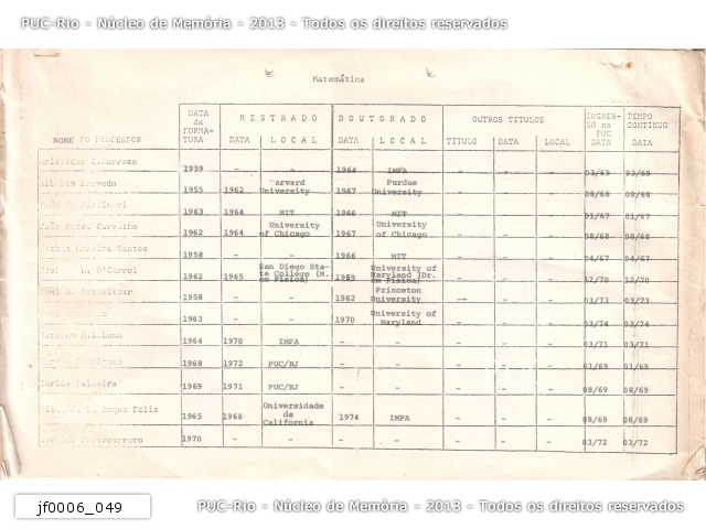jf0006_049 | 1975 | Lista de professores do Departamento de Matemática, com a sua titulação. |