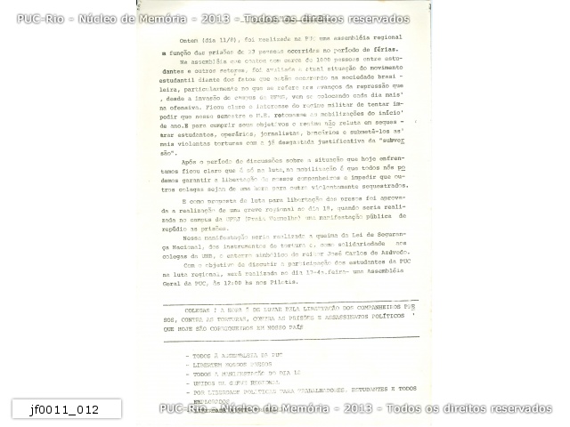jf0011_012 | 12/8/1977 | Sobre Assembleia Regional realizada na PUC-Rio, onde foram discutidas prisões e organizada uma manifestação contra a Lei de Segurança Nacional. |