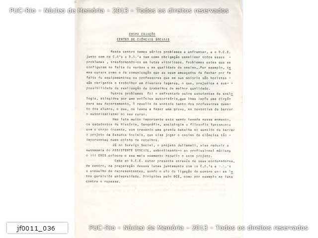 jf0011_038 | 12/3/1978 | Análise das causas da greve dos estudantes e professores da PUC-Rio. Pela readmissão dos professores demitidos e autonomia departamental. |