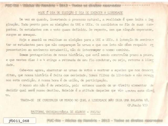 jf0011_068 | 1979 | Convocação para as eleições da UNE e das UEEs pela Pastoral Universitária de Alunos da PUC-Rio. Fala sobre ameaças ao processo de votação. |