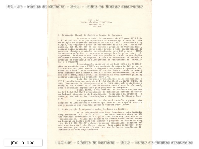 jf0013_098 | 1978 | Informe do CTC sobre o orçamento global do centro e fontes de recursos e a distribuição do orçamento pelas unidades do centro. 17/03/1978. |