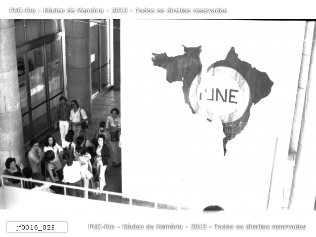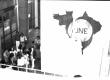 jf0016_024 | 4/10/1979 | Faixa com o mapa do Brasil e o nome "UNE", semi-rasgada, pendurada na parede ao lado dos elevadores da Ala Frings. |
