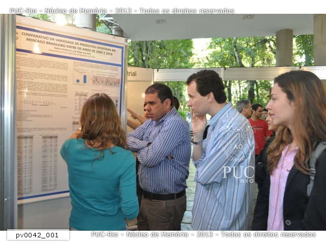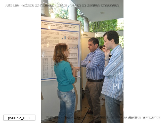 pv0042_001 | 23/8/2011 | Apresentações dos Bolsistas de Iniciação Científica do CTC no PIBIC 2011.2. 'Comparativo da Variedade de Produtos Ofertada ao Mercado Brasileiro entre os Anos de 2005 e 2010' - Débora Gutierrez; orientação do prof. Luiz Felipe Scavarda do Carmo. |