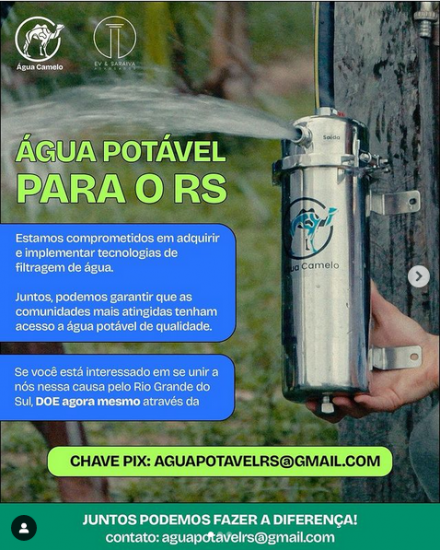 Uma forma de pessoas físicas ajudarem é participando dessa arrecadação de um parceiro nosso do Sul, a Ev e Saraiva Advogados. A arrecadação deles será revertida para custear o envio de mais produtos de filtragem de água para lá!